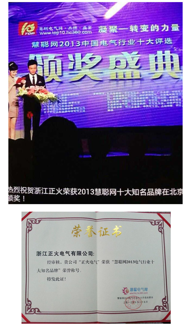 2013年10月25日,由慧聰電氣網(wǎng)主辦“2013中國電氣行業(yè)十大評選”頒獎(jiǎng)盛典在北京?慧聰網(wǎng)產(chǎn)業(yè)基地榮耀登場。作為行業(yè)年度盛事,慧聰網(wǎng)2013電氣行業(yè)十大評選活動(dòng)一如往屆,成為全行業(yè)的聚焦話題,引起了企業(yè)高管、協(xié)會(huì)領(lǐng)導(dǎo)、專家學(xué)者、經(jīng)銷商、媒體記者、消費(fèi)者等對本屆評選活動(dòng)的持續(xù)高度關(guān)注。其中,“十大知名品牌”獎(jiǎng)項(xiàng)競爭激烈,參選企業(yè)均是實(shí)力與影響力俱佳,最終浙江正火電氣股份有限公司憑借巨大優(yōu)勢躋身前十強(qiáng),斬獲“慧聰網(wǎng)2013電氣行業(yè)十大知名品牌”榮譽(yù)。