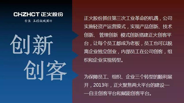 正火股份抓住第三次工業革命的機遇,公司實施輕資產運營摸式,實現產品創新、技術創新、 管理創新、模式創新、搭建正火創客平臺,讓每個員工都成為老板,員工也可以脫離企業獨立創業,內部員工在公司創客,組織和企業實現轉型。為保障員工、組織、企業三個轉型的順利展開,2013年,正火聚焦兩大平臺的建設——自主創客平臺和賦能創客平臺。