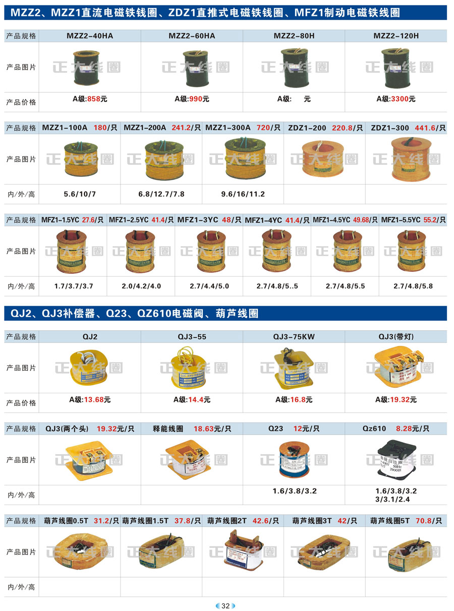 MZZ2、MZZ1直流電磁鐵線圈、MZD1直推式電磁鐵線圈、MFZ1制動電磁鐵線圈、QJ2、QJ3補償器、Q23、QZ610電磁閥、葫蘆線圈 ?