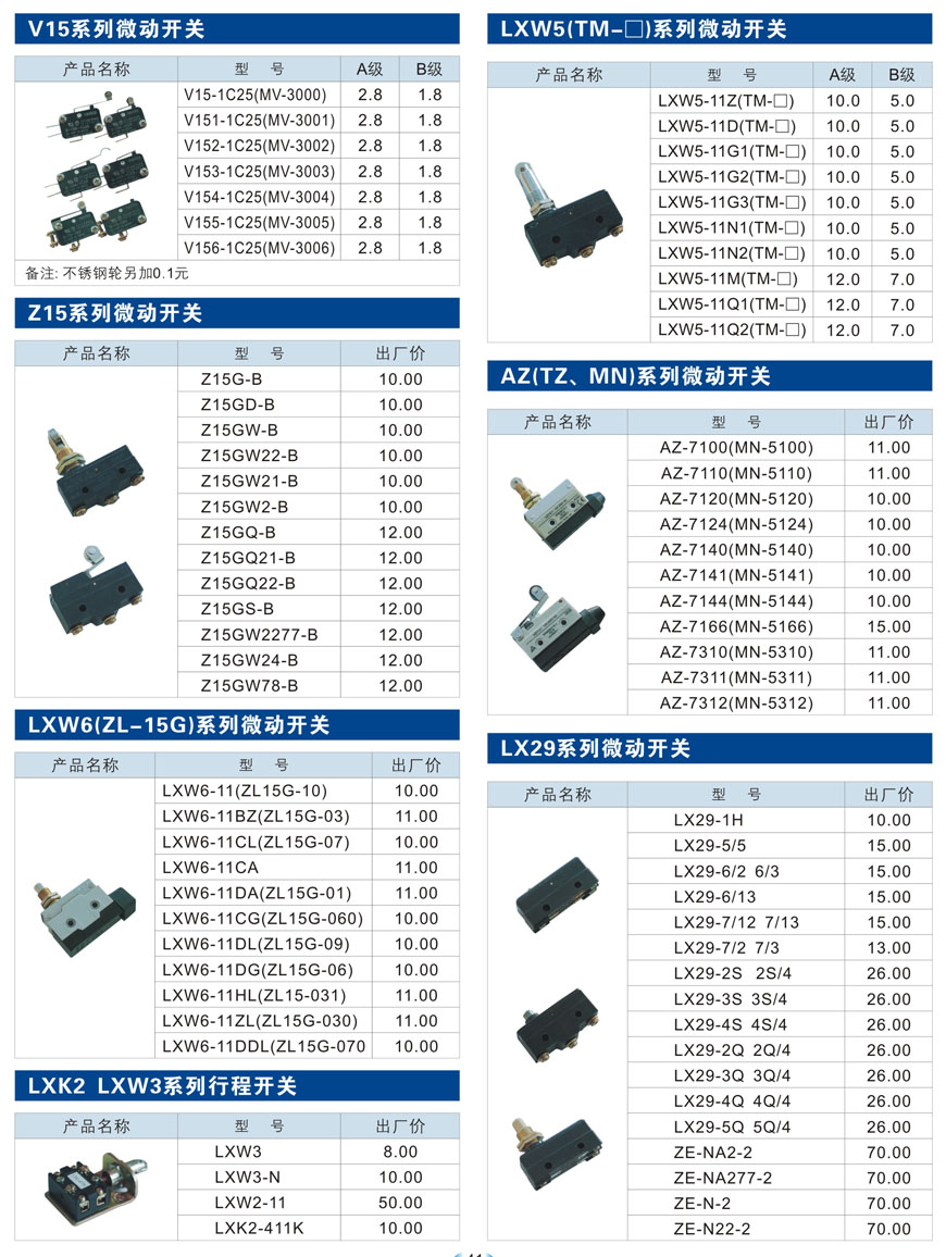 V15、Z15、LXW6(ZL-15G)、LXW5(TM-□)、AZ(TZ、MN)、LX29系列微動開關(guān)、LXK2 LXW3系列行程開關(guān)